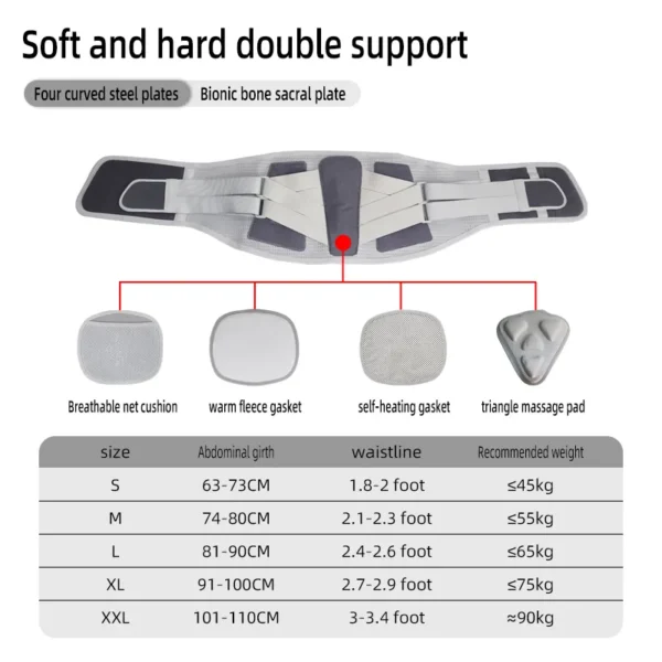 1. Ceinture de soutien lombaire avec mesures et instructions affichées pour une utilisation correcte et efficace.